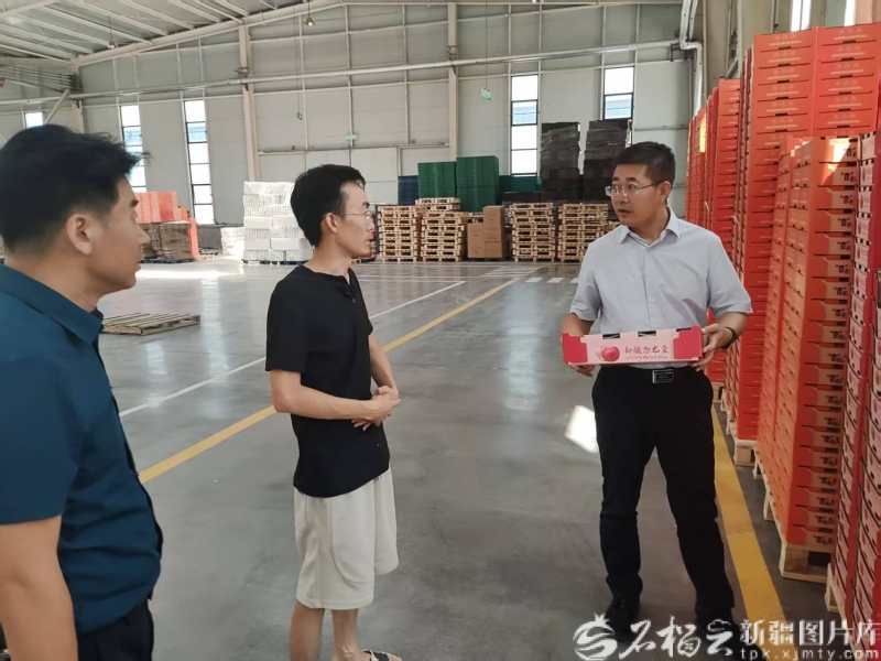 温宿国家农业科技园区党工委书记焦向阳(右一)在阿克苏长青纸箱包装有限公司进行调研。图/温宿国家农业科技园区提供(资料图)