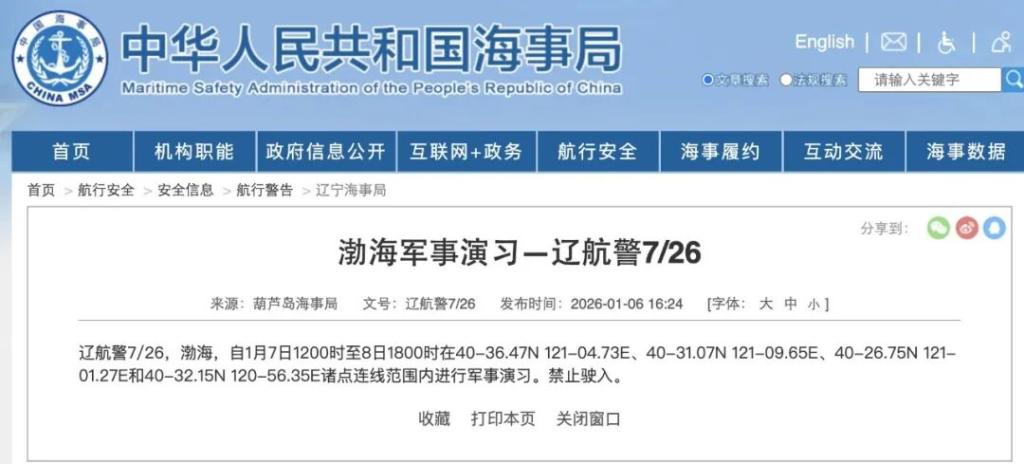 渤海,军事演习!禁止驶入!中国海事局网站 2026-01-07 13:56:51据中国海事局网站消息,葫芦岛海事局发布航行警告,1月7日12时至8日18时,渤海部分海域范围内进行军事演习,禁止驶入。 责任编辑:王蕾