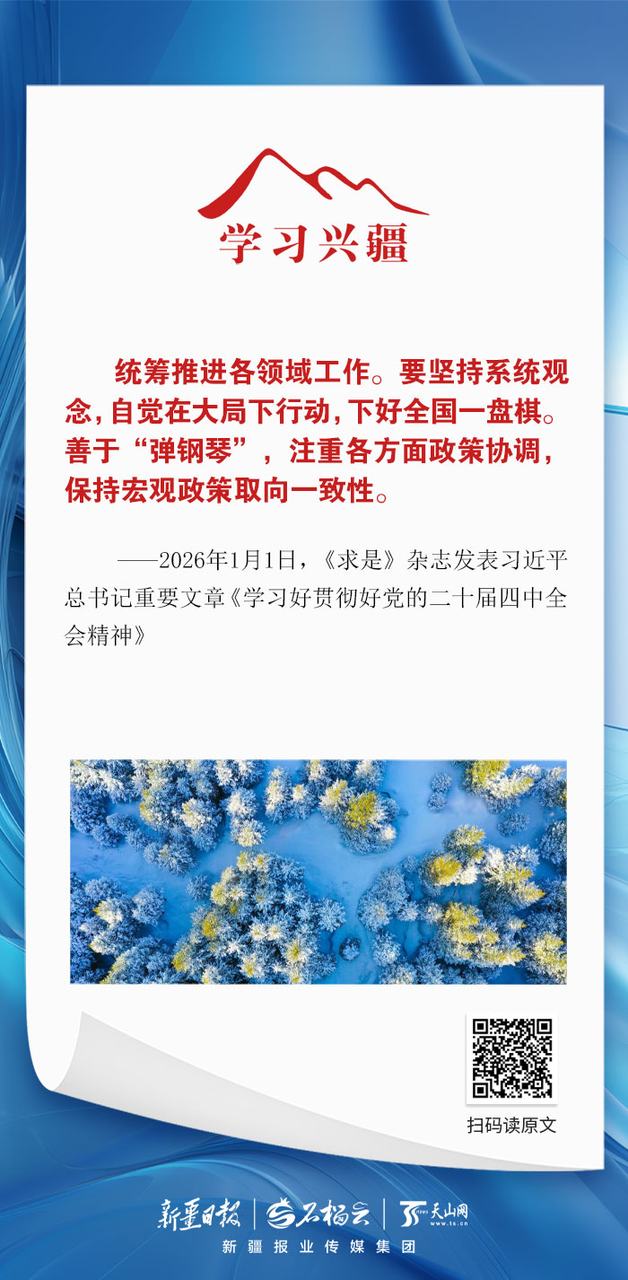 统筹推进各领域工作。要坚持系统观念,自觉在大局下行动,下好全国一盘棋。善于“弹钢琴”,注重各方面政策协调,保持宏观政策取向一致性。——2026年1月1日,《求是》杂志发表习近平总书记重要文章《学习好贯彻好党的二十届四中全会精神》