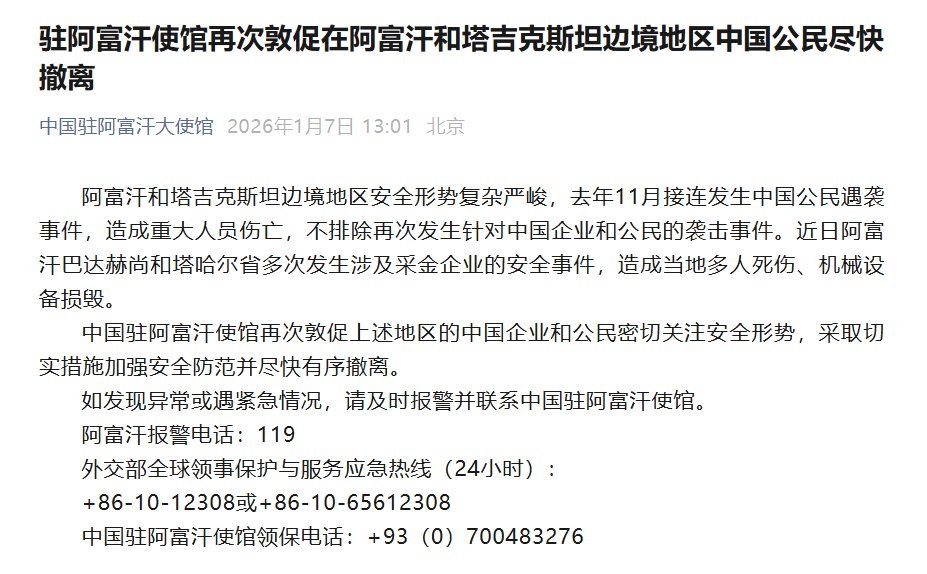 1月7日,据中国驻阿富汗大使馆:
