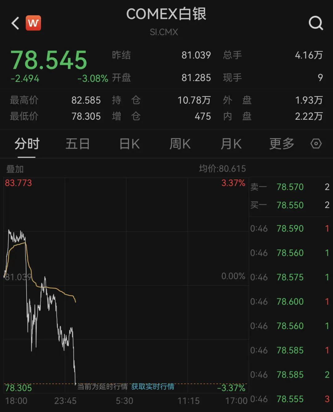 国际银价盘中跳水,截至发稿,COMEX白银跌超3%。