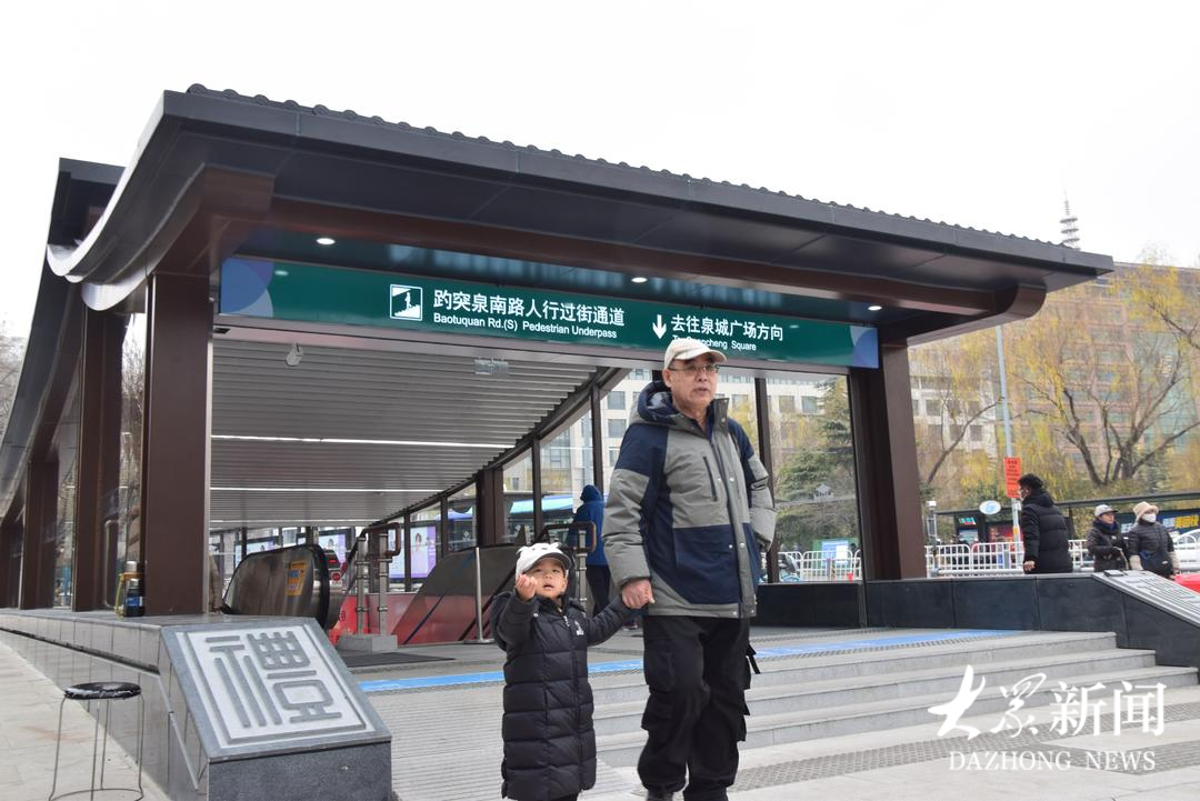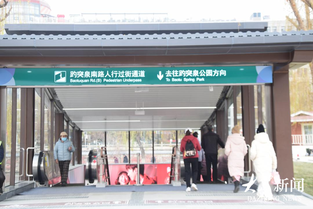 新建成的通道全长约64米,行人可在约2分钟内安全过街。设计上充分融入“一湖一环”景观体系,与环城公园慢行系统有机衔接。出入口分别位于泉城广场西北侧绿化带及趵突泉公园东门北侧广场,均配备自动扶梯、步行楼梯与无障碍电梯,兼顾通行效率与人文关怀。