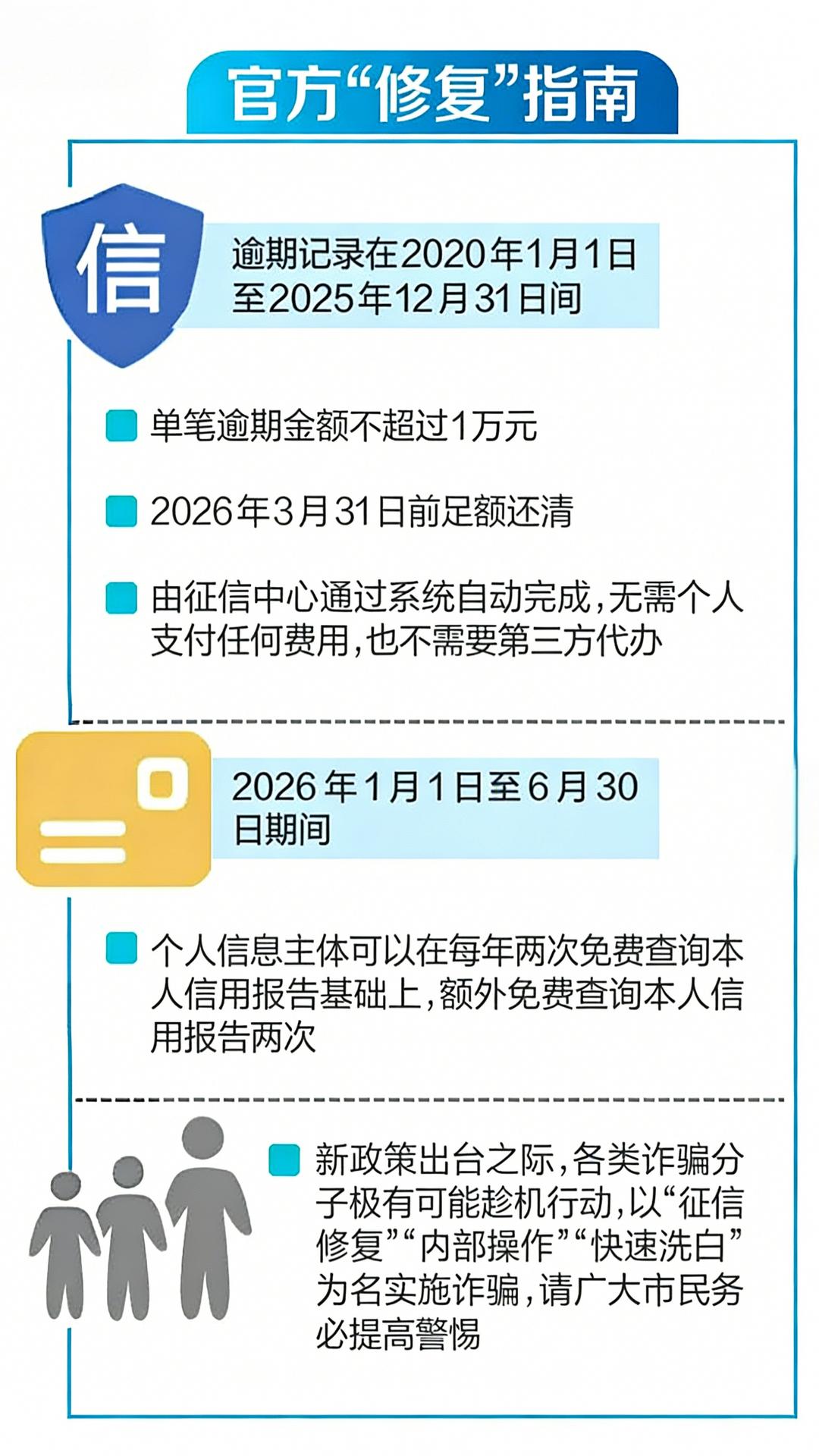 近期,中国人民银行发布一次性信用修复政策,宣布自2026年元旦起,对特定历史时期的个人小额逾期记录实施有条件、一次性的信用修复。不少率先行动的用户纷纷晒出“修复”完成、逾期记录清零的个人信用报告。与此同时,也有机构招揽生意,声称可付费进行“信用修复”。专家提示,作为“经济身份证”,个人征信愈发受到重视,但要小心有人浑水摸鱼,“越帮越忙”。