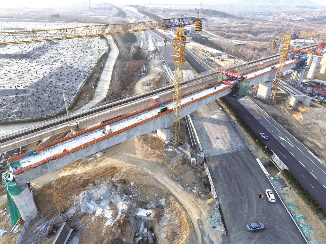 值得注意的是,这里地面是荣乌高速改扩建施工现场,抬头是龙烟市域铁路跨荣乌特大桥施工现场,立体交通的缩影在此格外真切。