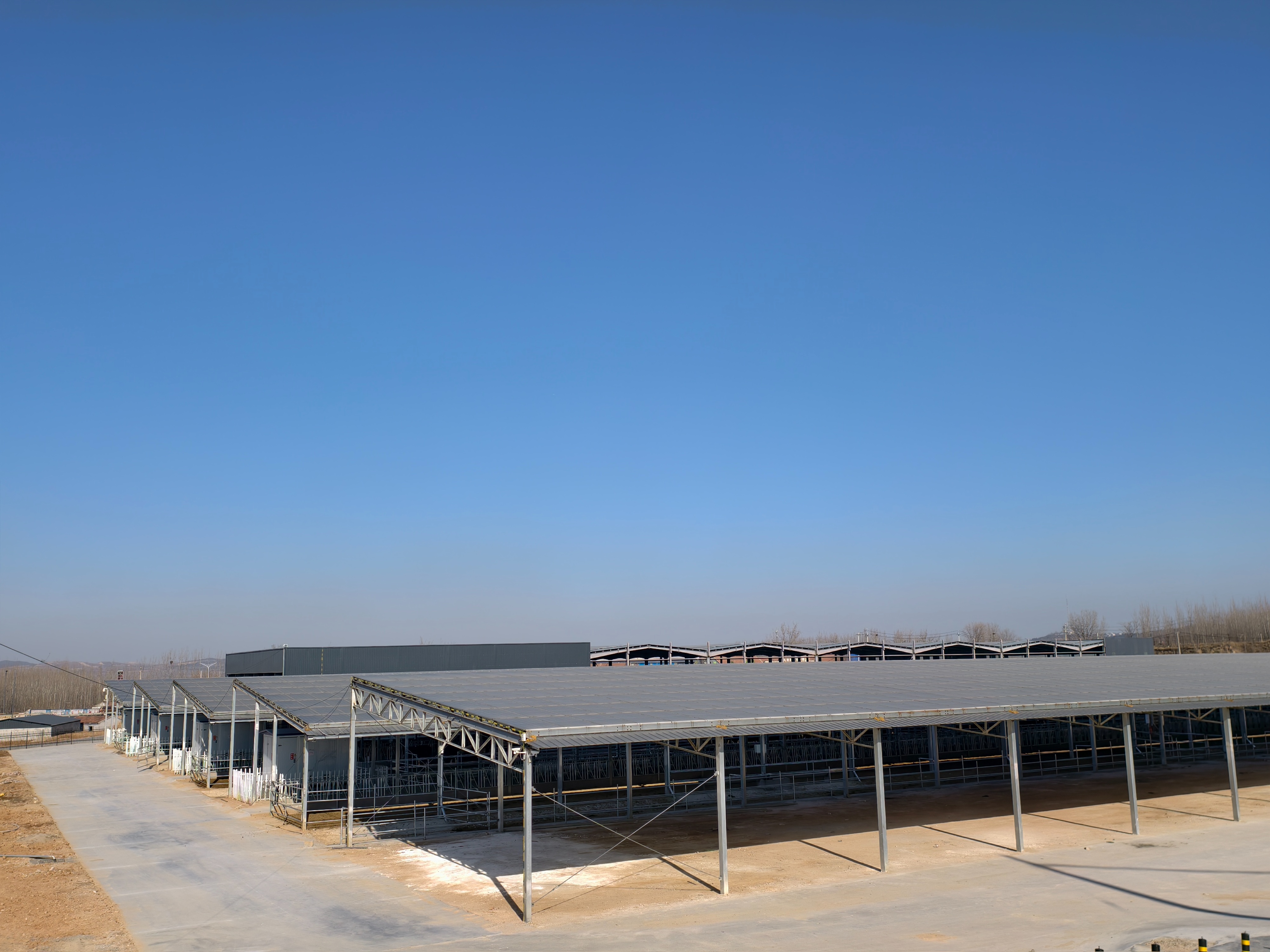 肉牛养殖示范基地总投资7400万元,占地128亩,可存栏肉牛2000余头,同时打造全市首家“牧光互补+绿色生态+种养循环”模式,配套棚顶分布式光伏电站,年发绿电700万度,实现养殖与清洁能源的高效融合。