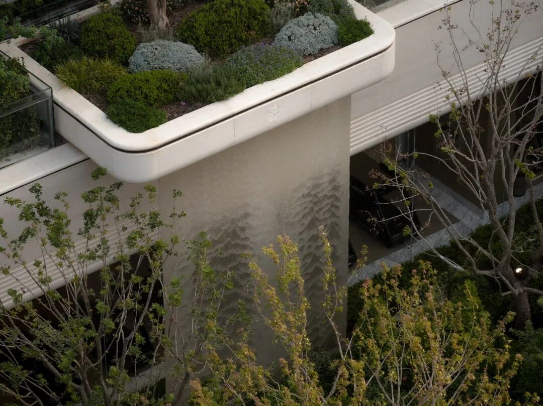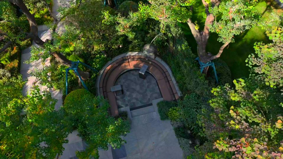 时光流影下沉庭院,是一处大隐于市的“心灵秘境”。其设计灵感源自波斯古老的费恩花园,萃取其几何秩序、叠水意境与植物秘境。庭院最震撼的笔触,是中轴线上的“翡翠之心”中央水景:整块被誉为奢石界“爱马仕”的蓝翡翠奢石雕琢成台,360°环形水幕如丝帘般均匀滑落,潺潺水声衬出“清泉石上流”的诗画意境。它将自然美学升华为可沉浸感受的日常艺术,为居者提供一处涤荡纷扰的静思之地。