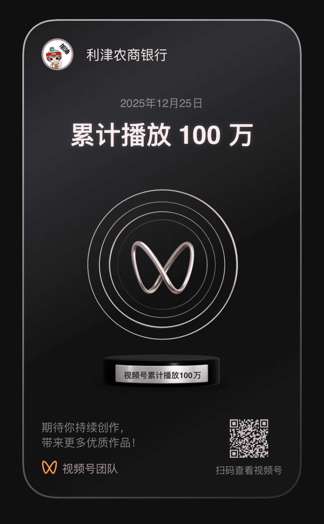 2025年末,利津农商银行视频号累计视频播放总量突破一百万次,标志着该行在新媒体账号运营方面取得“里程碑”式重要成果。