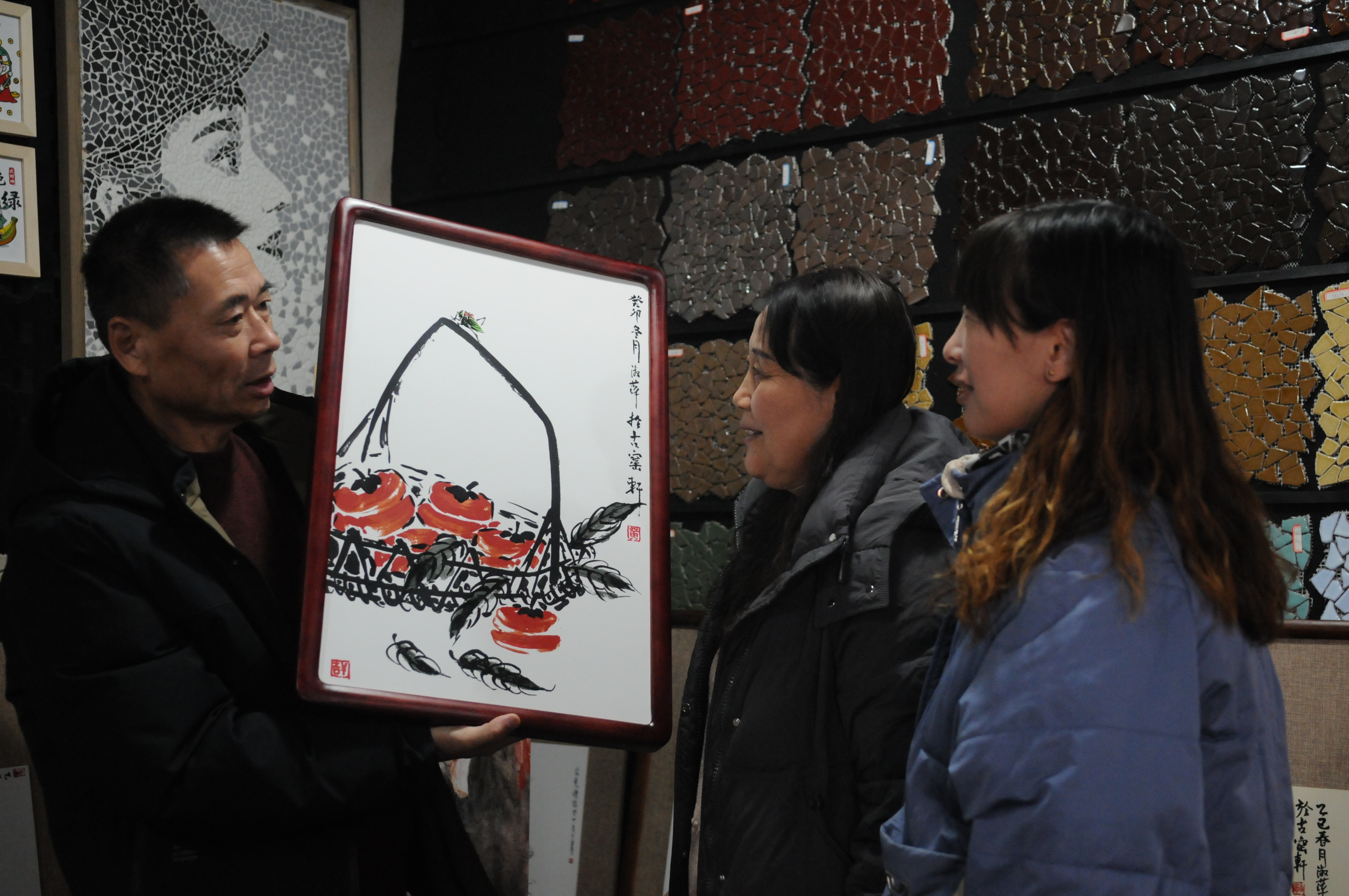 1月7日,山东省淄博市淄川区古窑轩艺术馆工作人员向市民介绍瓷板画。瓷板画是国家级非物质文化遗产,创作人员直接在瓷板上进行创作,经高温烧制而成,具有色彩艳丽、不褪色、不变形、独一性等特点,适合于家庭装饰、单位美化等。近年来,古窑轩艺术馆主创人员不断加大“两创”力度,将通俗文化、生肖文化等与瓷板画技艺相融合,推出了一批不同规格、多元主题的文创产品,深受年轻人喜爱,成为市场新宠。