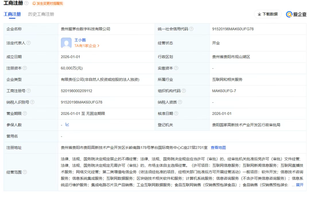2026年新年伊始,白酒行业龙头贵州茅台抛出重磅转型信号:1月1日,全资控股的贵州爱茅台数字科技有限公司(下称“爱茅台数科”)正式注册成立,注册资本高达6亿元,业务版图横跨互联网服务、区块链技术、芯片销售等多个领域。一场围绕渠道重构与数字生态构建的深度变革已然拉开序幕。