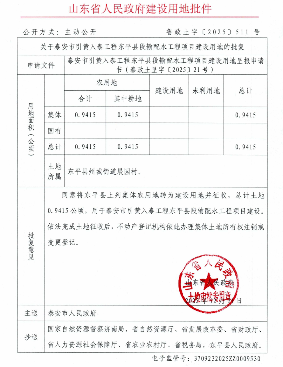 2025年12月31日,泰安市引黄入泰工程东平县段输配水工程项目建设用地经山东省人民政府批准。现公告如下: