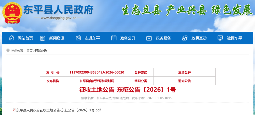 1月5日,东平县人民政府网站发布一则征收土地公告,具体如下: