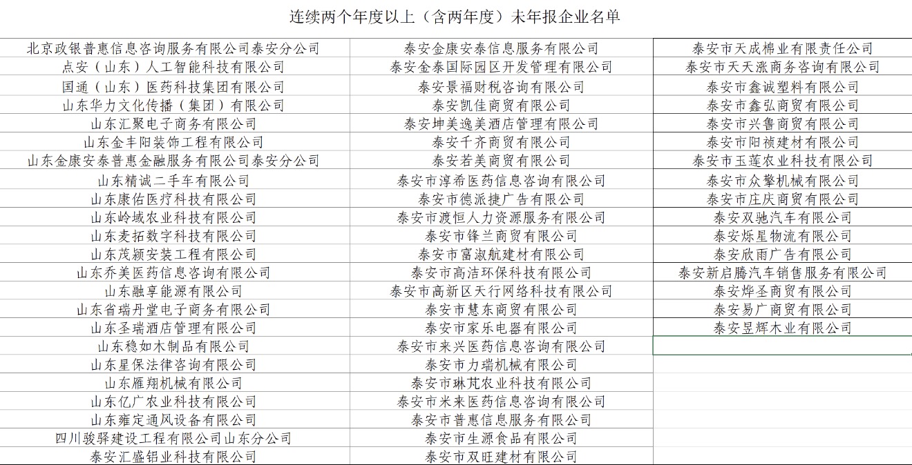 一、截至2026年1月6日,北京政银普惠信息咨询服务有限公司泰安分公司等62家企业连续两个年度以上(含两年度)未按照国务院《企业信息公示暂行条例》的规定在“国家企业信用信息公示系统”公示企业年报,现将企业名单予以公告。