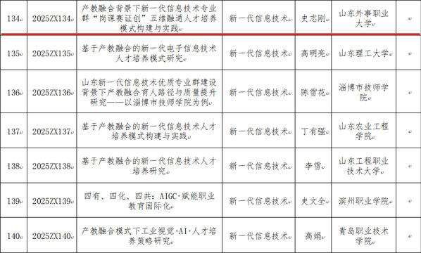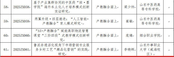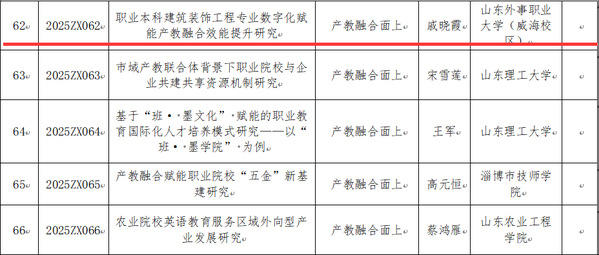 近日,山东省职业教育和产业人才研究院印发《关于公布2025年度山东省职业教育产教融合研究专项课题立项名单的通知》(省职研函〔2025〕23号)。经个人申报、单位推荐、研究院初审、专家评审和结果公示等程序,全省共有140项课题获批立项。山东外事职业大学凭借扎实的研究基础和持续的实践探索,共有三项课题成功获批,充分体现了学校在职业教育产教融合领域的研究实力与实践成效。