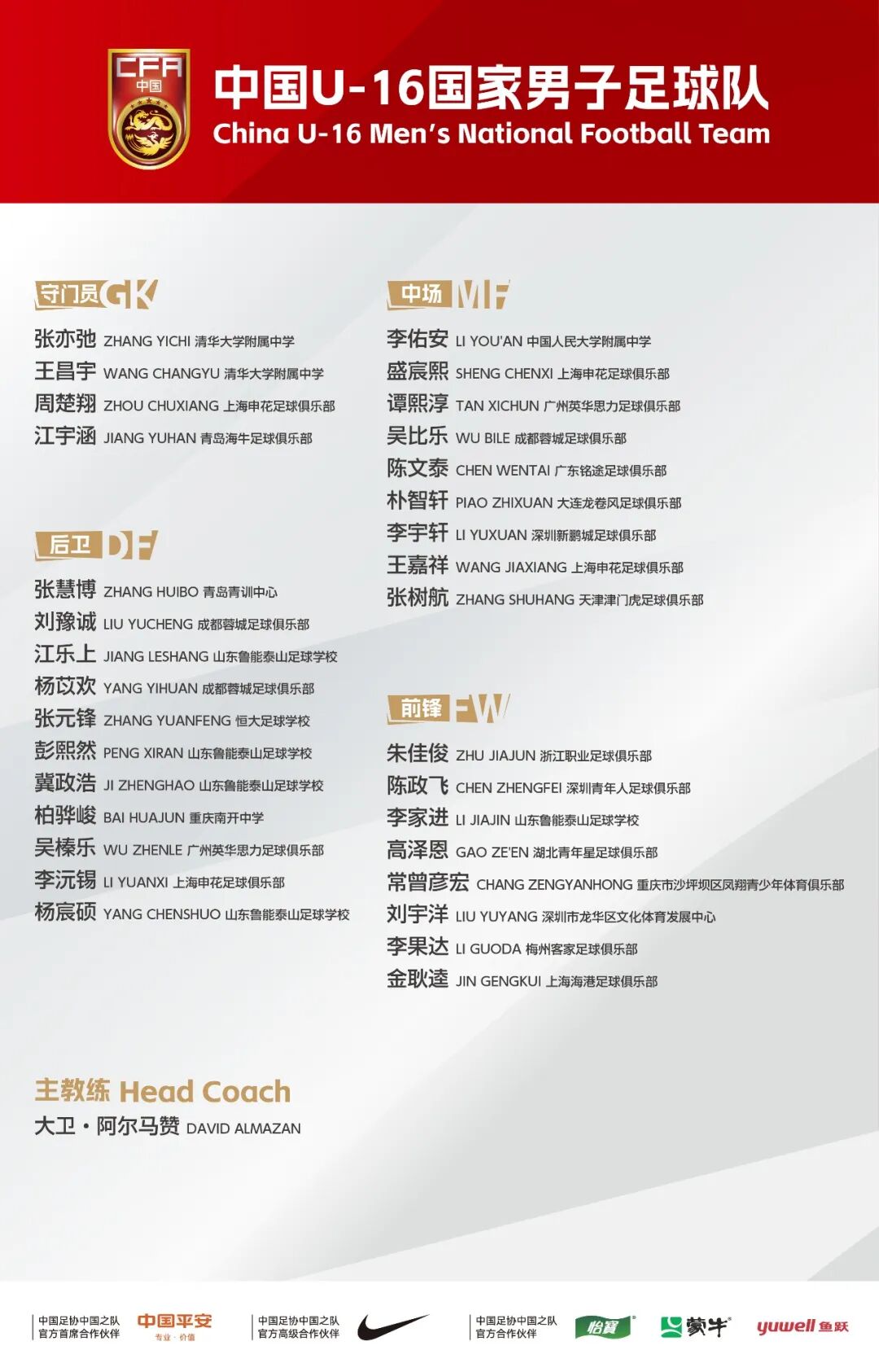 为备战2027亚足联U17亚洲杯,经队伍教练组研究,中国足球协会批准,中国U-16国家男子足球队定于2026年1月12日至2月8日赴福建省漳州市组织集训,期间将进行封闭教学赛。具体名单如下: