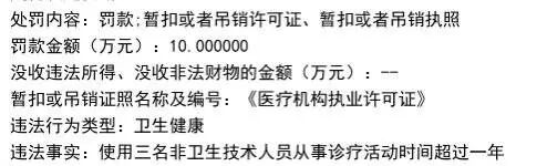 同年6月,桥西区卫生健康局也对该院作出了罚款10万元,暂扣或吊销许可证、执照的处罚。其违法事实为“使用三名非卫生技术人员从事诊疗活动时间超过一年”。