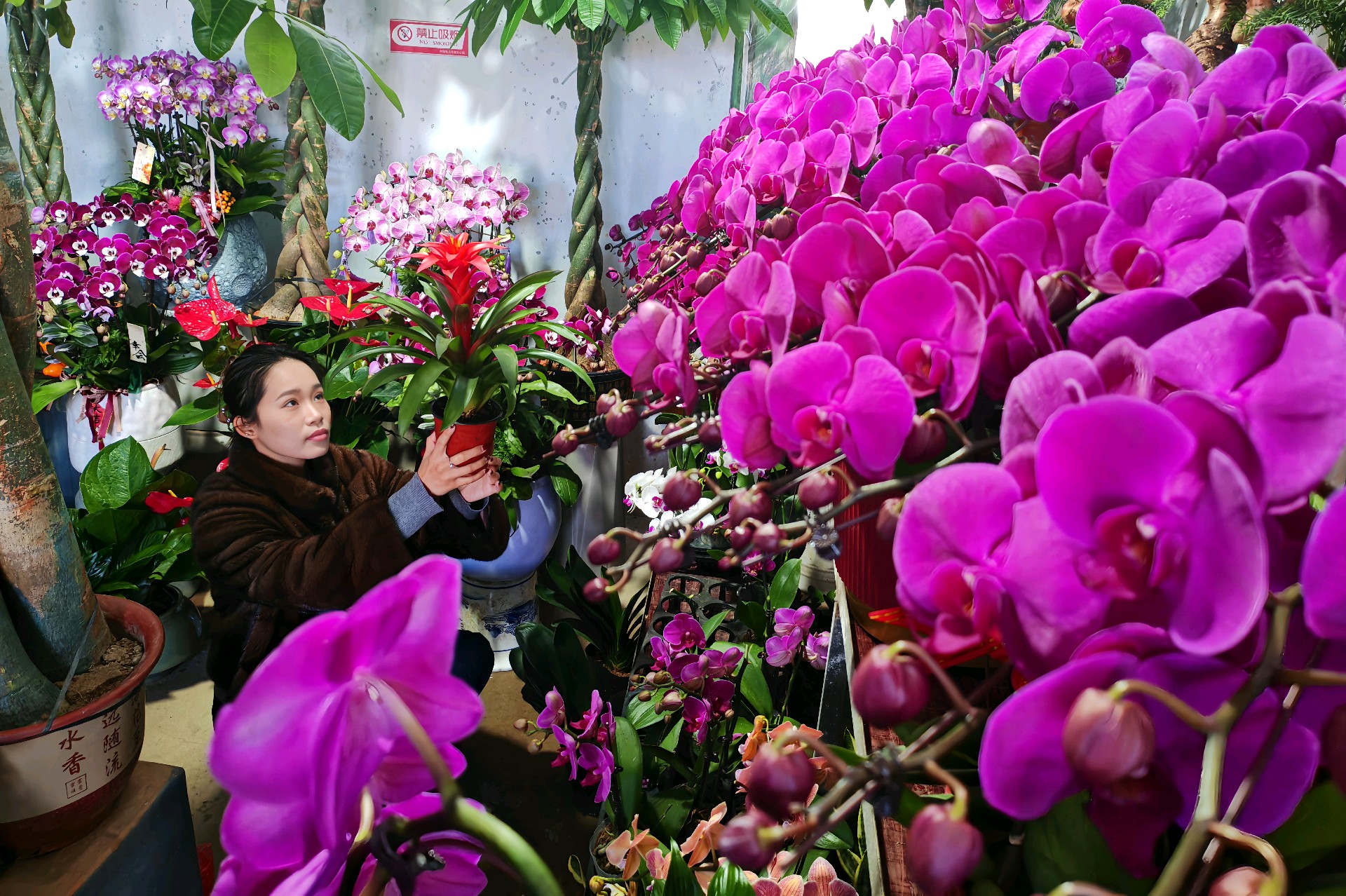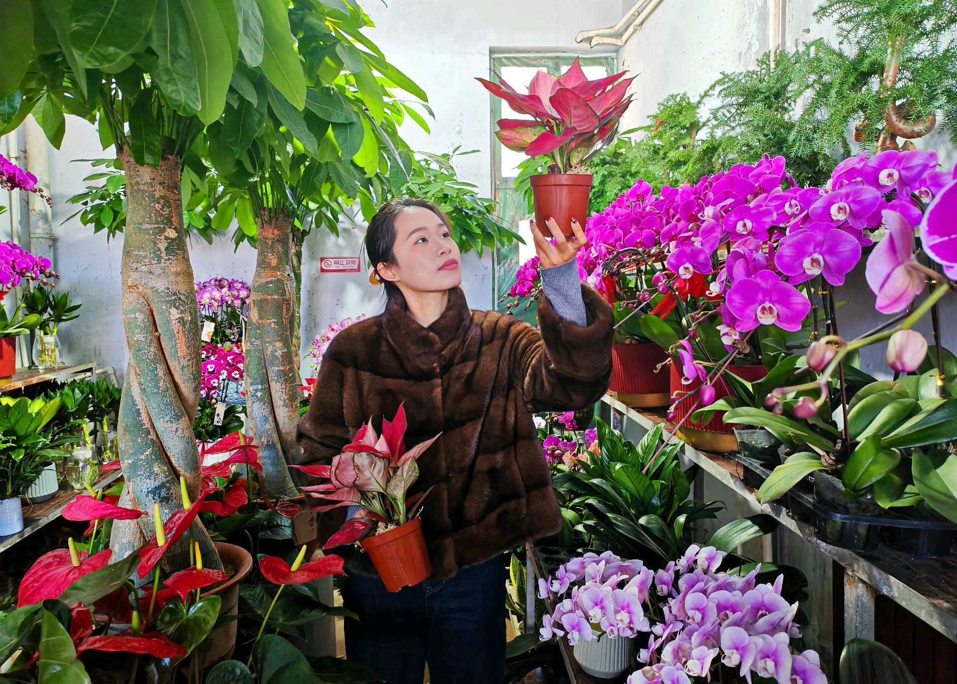 2026年1月7日,市民在山东省无棣县海丰街道于庙村向国花卉挑选鲜花。近日,向国花卉的门店和育苗基地上,从传统的蟹爪兰、长寿花、三角梅,到时下流行的蝴蝶兰、金桔、腊梅等,琳琅满目,应有尽有,来选花、买花的市民络绎不绝。该街道像这样的花卉基地有10余个,满足了广大市民需求。(大众新闻通讯员高士东成昱瑄报道)