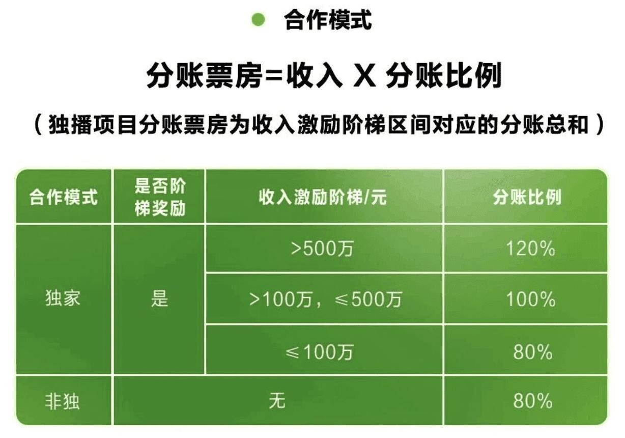 不久前,爱奇艺对外发布2026年电影分账合作新规,此次新规将分账逻辑从“时长单价”转向“收入分账”。符合相关要求的院线电影,分账公式为“分账票房=收入×分账比例”,其中收入指扣除运营成本后的净收入,包含会员时长、广告收入等。针对独播项目,设置了三级收入阶梯:收入超过500万元则分账120%,100万-500万元区间分账100%,小于等于100万元分账80%;非独播项目固定分账80%,分账周期统一为自影片上线之日起180天。