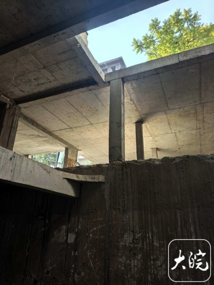 1月7日,一位居民向大皖新闻记者提供了小区内此前搭建的违规建筑的图片。图片显示,楼体间的承载柱很细。“都是糊弄的,基本上没有考虑载荷与拉力,下面就是车库。”受访居民忧心忡忡地说。