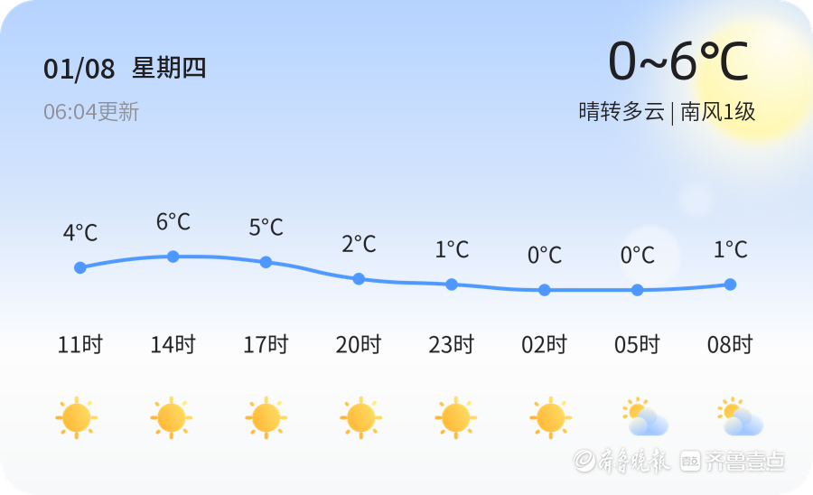 今天是2026年1月8日,星期四,农历十一月二十。济宁市今天天气晴转多云,气温范围在0℃到6℃之间,南风1级,空气湿度为74%。根据PM2.5指数56,空气质量状况为良。今天气温较低,市民出行时应做好保暖措施,尤其是早晨和傍晚,气温较低,建议穿棉衣或羽绒服。同时,南风1级,风力较小,适合户外活动。