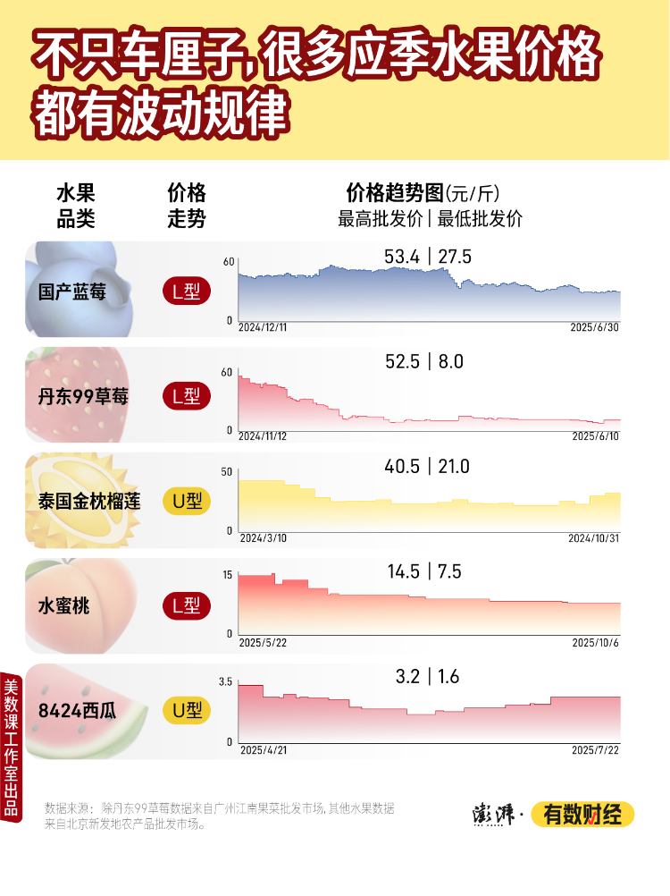 其实不仅是车厘子,不少水果也有类似的“刚上市时贵,等等更划算”价格波动规律。