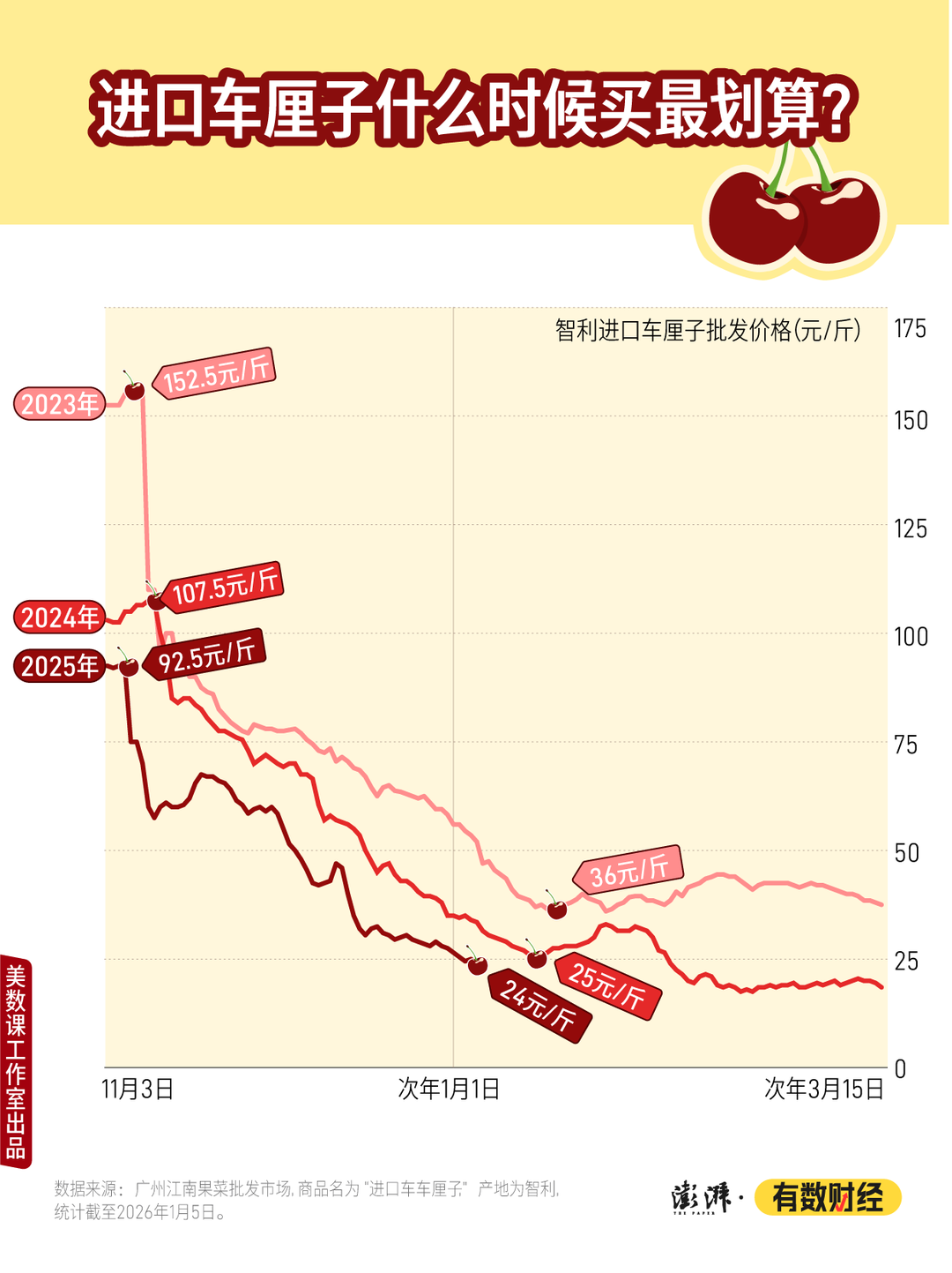 最近,社交媒体的热搜榜单上,车厘子这个词频繁现身。有媒体近期探访了山姆会员商店的3J车厘子售价,发现已从2025年11月中旬的每斤100元下降到了30元出头。