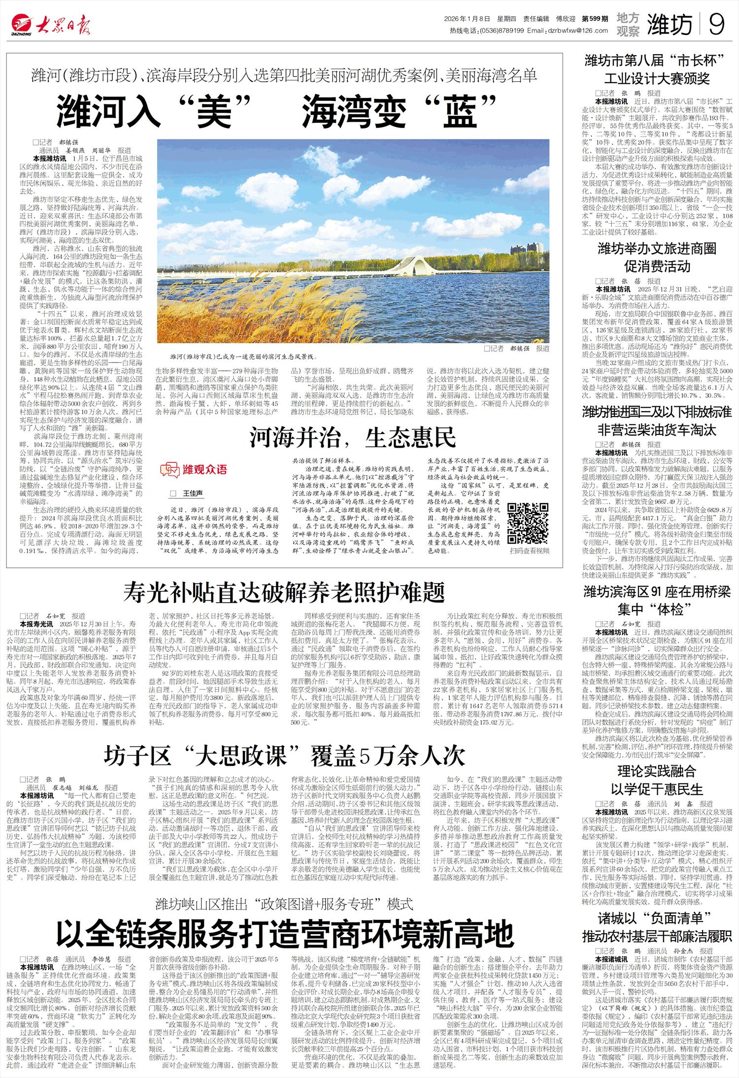 近日,潍河(潍坊市段)、滨海岸段分别入选第四批美丽河湖优秀案例、美丽海湾名单,这并非偶然的荣誉,而是潍坊坚定不移走生态优先、绿色发展之路,坚持陆海统筹、系统治理的必然成果。这份“双优”成绩单,为沿海城市的河海生态共治提供了鲜活样本。