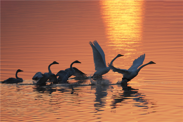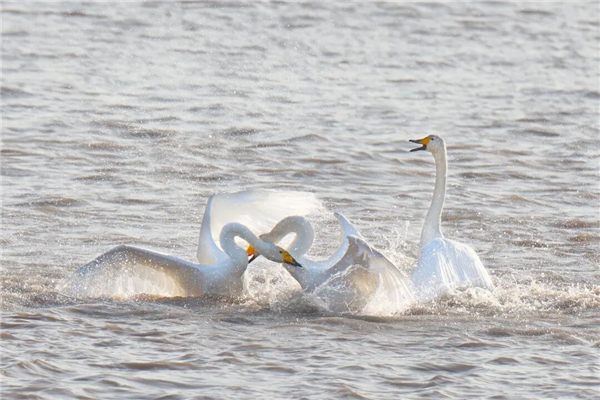 随着生态环境的持续改善,这里已成为大天鹅等鸟类的生态家园,来济过冬的大天鹅等候鸟逐年增多,最多时可达近300只。记者在现场看到,天鹅时而低头觅食,时而结伴游弋优雅惬意,构成了一幅人与自然和谐共生的绝美画卷。