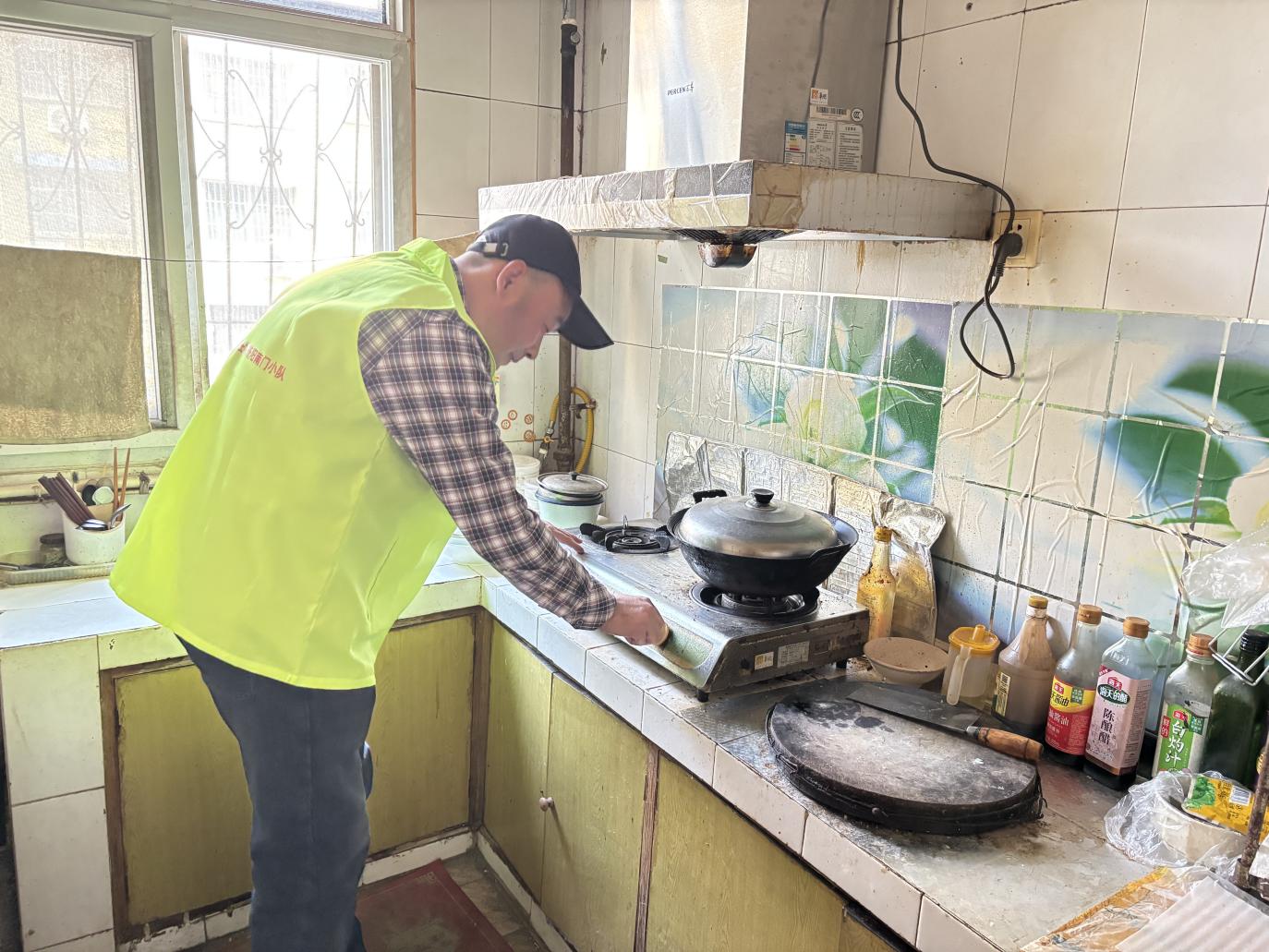 社区网格员梳理出独居老人、高龄老人等重点关注群体,以“敲门入户”的方式,逐户进行燃气安全检查。退役军人志愿者仔细查看燃气灶具和燃气的使用情况,检查天然气软管是否存在龟裂、脱落情况,测试是否正常工作。对于发现的安全隐患,能当场整改的立即协助处理;无法当场解决的,详细记录并联系专业人员上门维修。