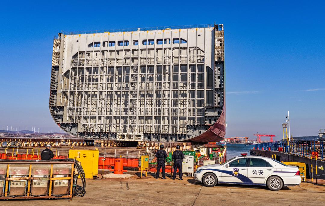 1月6日,在荣成市俚岛镇三星重工业(荣成)有限公司港区,由韩国籍MEGA CARAVAN(卡罗湾)轮装运的大型液化天然气运输船船段分段顺利装船,发往韩国巨济。