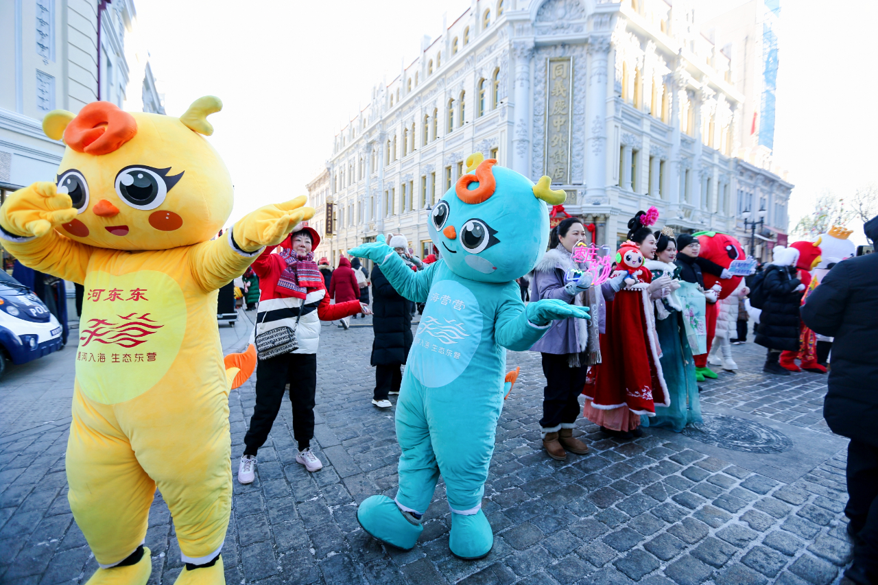 1月5日,在中华巴洛克历史文化保护街区,“山东文旅天团尔滨走亲戚”快闪巡游火热上演。东营城市卡通吉祥物“河东东”“海营营”与全省各市代表一同,踏着山东特色旋律欢快起舞,仿佛变成了全场最靓的仔。