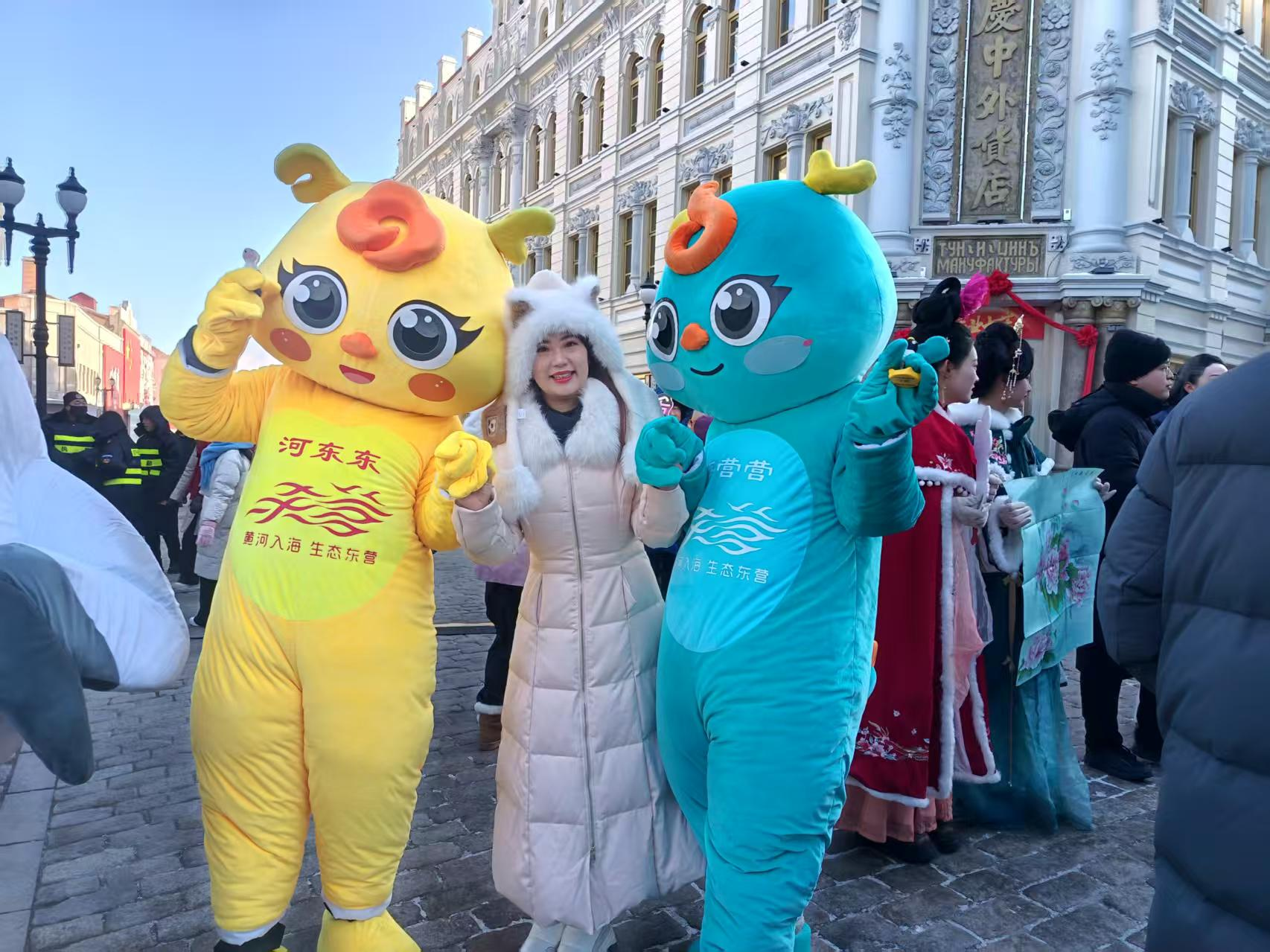 1月4日至5日,在第42届哈尔滨国际冰雪节举办之际,东营市文化和旅游局跟随山东省文旅厅赴哈尔滨参加“冰雪季的山东温度”宣推活动。活动期间,东营文旅推介官携手城市卡通吉祥物“河东东”“海营营”精彩亮相哈尔滨冰雪大世界与百年巴洛克文化街区,向冰城人民递出了来自黄河入海口的文旅名片。从黄河尾闾到松花江畔,一场跨越千里的“冬日之约”在冰城火热上演!