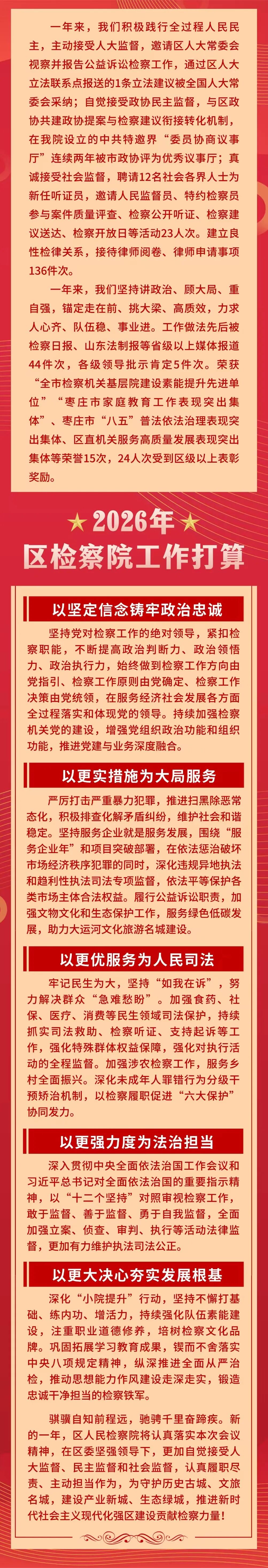 报告从自觉服务大局,以高质效检察履职护航高质量发展;坚持人民至上,以高质效检察履职增进民生福祉;强化法律监督,以高质效检察履职维护执法司法公正;强基固本提质,以高质效自身建设提升检察履职素能四个方面回顾了2025年台儿庄区人民检察院工作所取得的成绩,并从以坚定信念铸牢政治忠诚,以更实措施为大局服务,以更优服务为人民司法,以更强力度为法治担当,以更大决心夯实发展根基五个方面明确了2026年检察工作目标任务。