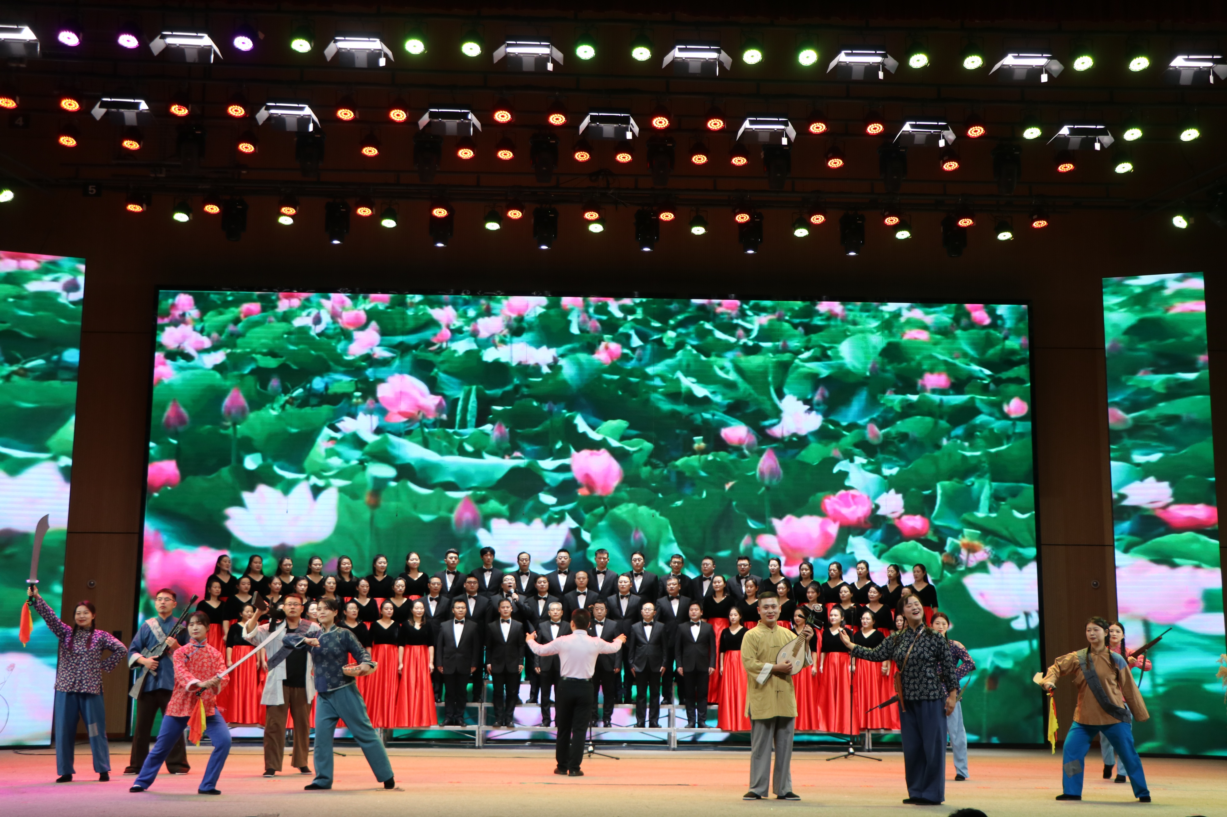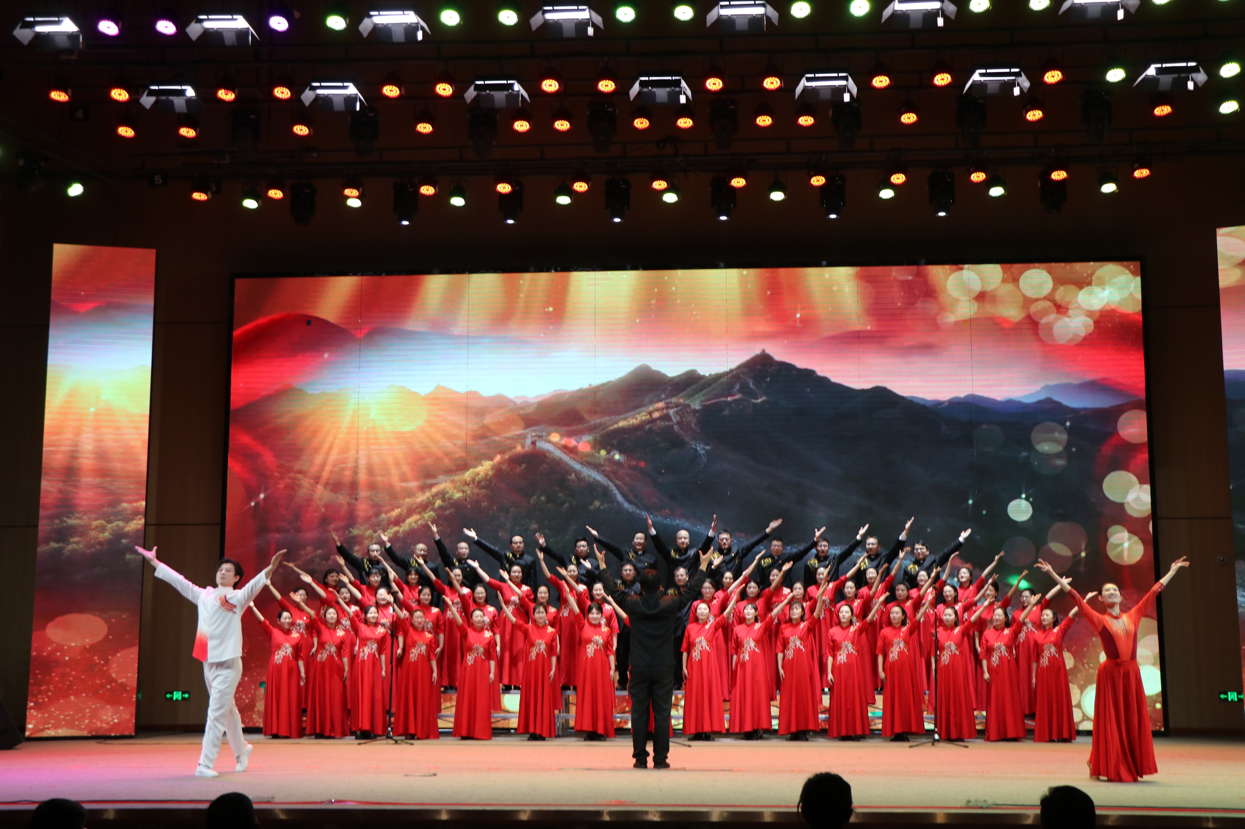 活动现场灯火璀璨,气氛热烈。《唱支山歌给党听》《弹起我心爱的土琵琶》等一首首经典红歌轮番唱响,时而激昂雄壮,时而温情脉脉。从“烽火征程·丹心报国”到“春风浩荡·筑梦前行”,再到“盛世华章·领航新程”,三个篇章层层递进,合唱队员们精神饱满、意气风发,用真挚的情感和精湛的演绎,将红色故事与时代精神融入旋律,让现场观众在歌声中重温峥嵘岁月、感受奋进力量。