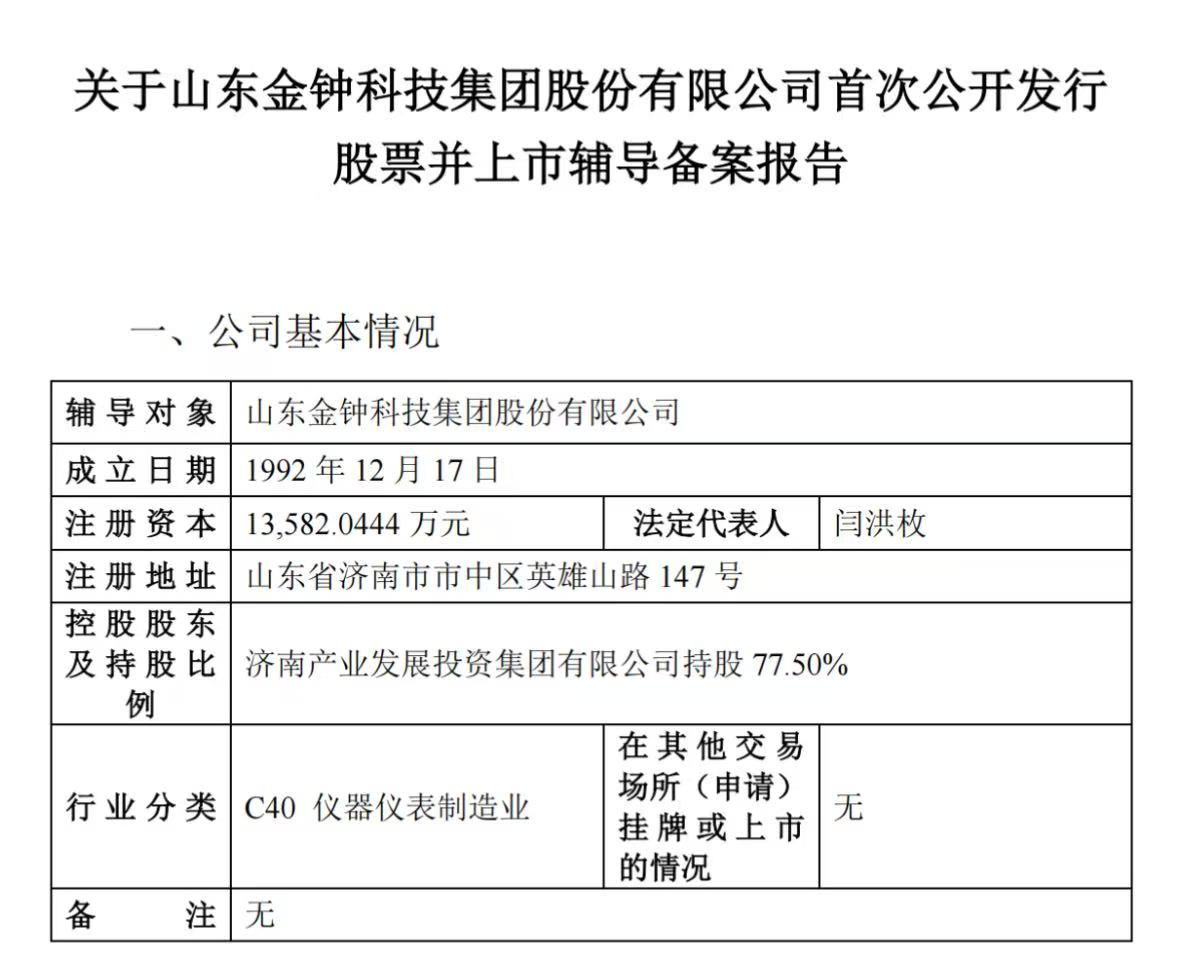 从股权结构来看,金钟科技控股股东为济南产业发展投资集团有限公司,后者为济南市属国企。金钟科技披露的辅导备案报告显示,济南产业发展投资集团有限公司对其持股77.5%。