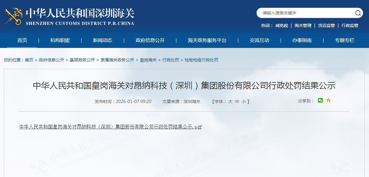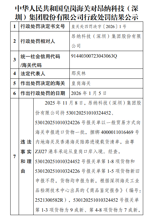 齐鲁晚报·齐鲁壹点记者于中华人民共和国深圳海关的隶属海关政务公开栏“检验检疫行政处罚”版块获悉,1月7日,昂纳科技(深圳)集团股份有限公司(下称“昂纳科技”)收到罚单,被罚原因涉及“进口旧机电产品未报检”。处罚决定书文号:皇关处四罚决字〔2026〕1号。