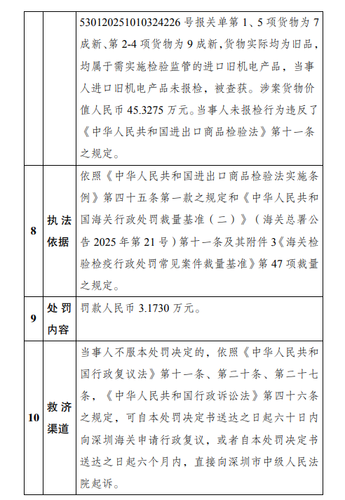 经查,530120251010324452号报关单第1-8项货物和530120251010324226号报关单第1-5项货物新旧申报不符,货物均申报为新,根据深圳海关工业品检测技术中心出具的《商品鉴定报告》(编号:2521300582R),530120251010324452 号报关单第1-3项货物为9成新、第4-8项货物为7成新,530120251010324226 号报关单第1、5项货物为7成新、第2-4项货物为9成新,货物实际均为旧品,均属于需实施检验监管的进口旧机电产品,当事人进口旧机电产品未报检,被查获。