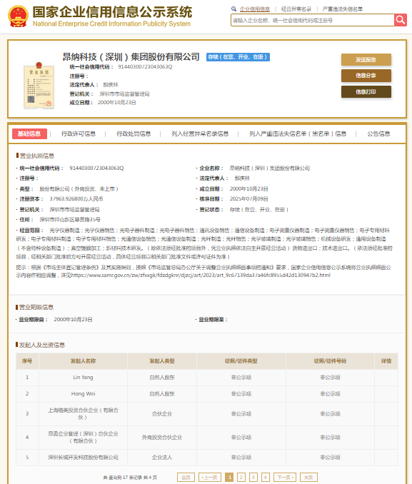国家企业信用信息公示系统显示,昂纳科技(深圳)集团股份有限公司成立于2000年,法定代表人那庆林,注册资本37963.9268万元人民币。
