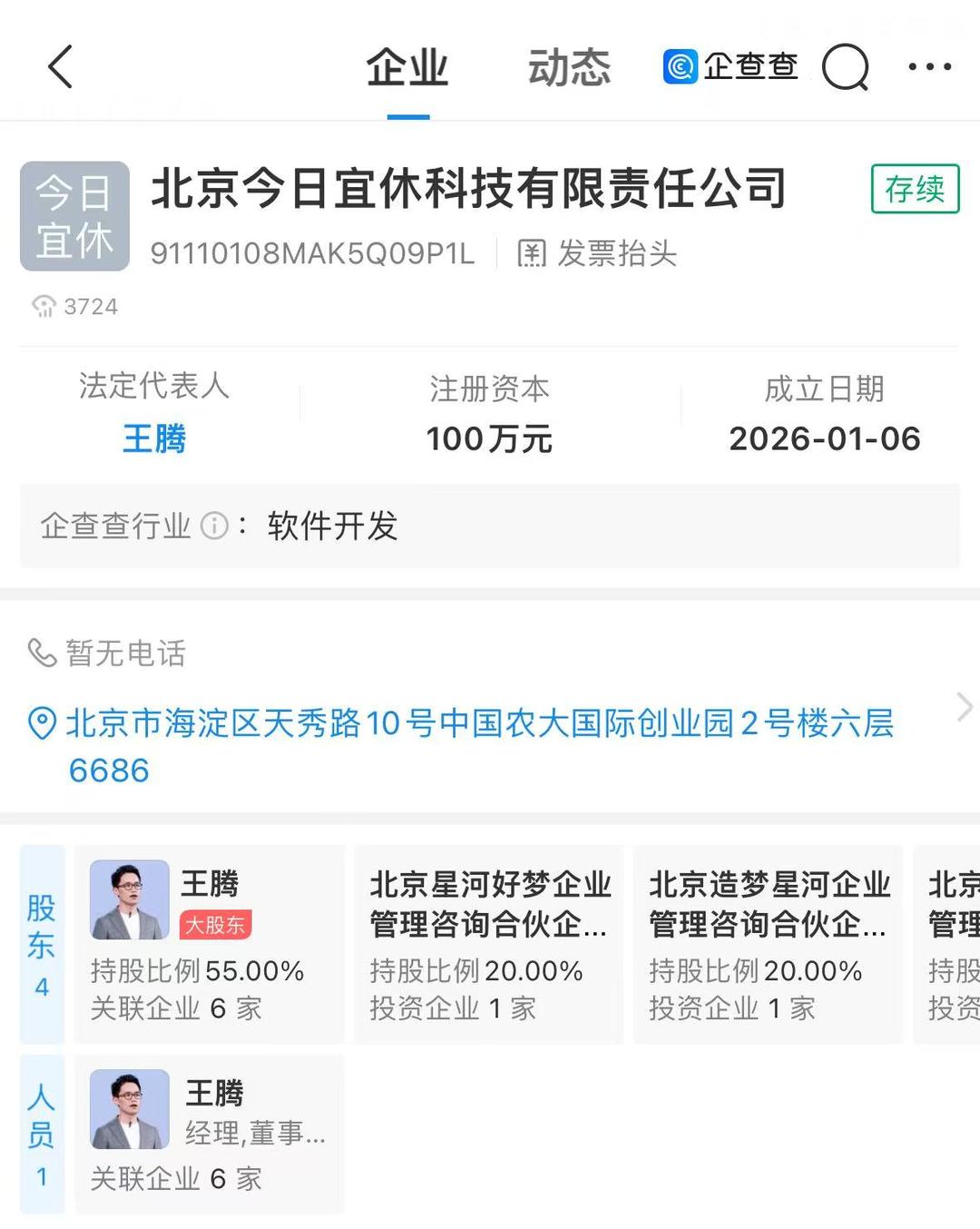 经济导报记者在企查查查询到,“今日宜休”全称为北京今日宜休科技有限责任公司,法定代表人为王腾,注册资本100万元人民币,于2026年1月6日成立。