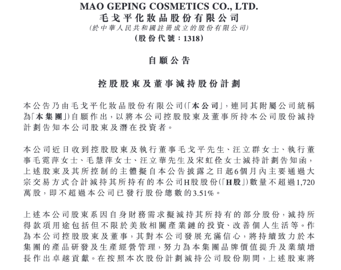 上市刚满一年,毛戈平化妆品股份有限公司(01318.HK,下称“毛戈平股份”)控股股东及多位执行董事计划进行集体减持。