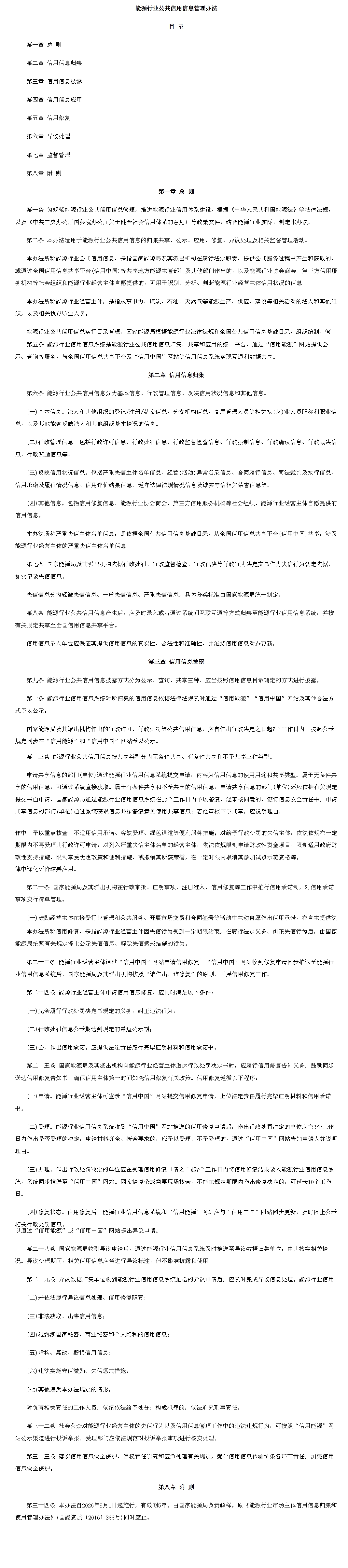 二是全面提升公共信用信息管理质效。《办法》立足建立能源行业公共信用信息归集共享、公示披露、评价应用、信用修复、异议处理及相关监督管理活动全链条制度规范,与失信行为分类、守信激励和失信惩戒监管应用措施、经营主体合法权益保障等实现有效衔接,强化信用体系建设及信用监督管理工作的针对性和权威性,进一步深化信用信息在行业管理和公共服务中的融合应用,充分释放信用管理效能。