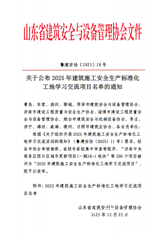 近日,山东省建筑安全与设备管理协会印发《关于公布2025年建筑施工安全生产标准化工地学习交流项目名单的通知》,滨州市推荐的13个项目全部成功入选,入选数量位居全省第5位,充分彰显了滨州建筑施工安全生产标准化建设取得扎实成效。