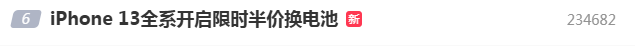 1月7日,#iPhone 13全系开启限时半价换电池#登上微博热搜,苹果官宣iPhone13全系开启限时半价电池换新服务,该服务将持续到4月30日。