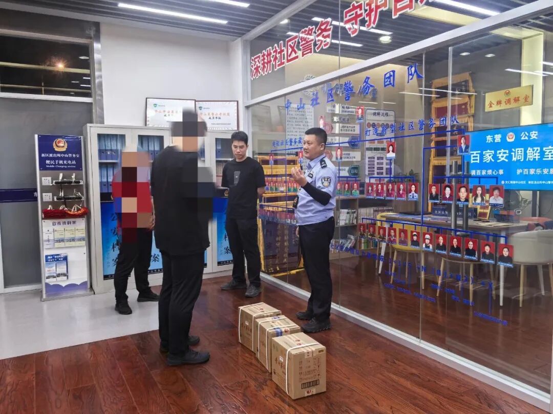 依托东营公安分局夏季“一警三派”机制,新区派出所中山社区民警王青涛与办案民警刘希义、侯保卿联合调查,经大量工作,案发当晚深夜11点,3箱茅台便被追回并送至社区警务室。