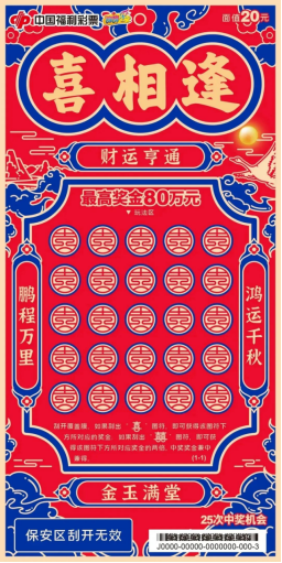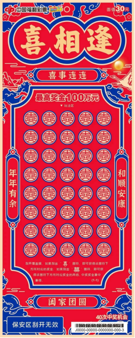 中奖奖金之最:刮刮乐“喜相逢30元”是“喜相逢”系列彩票中的一款,“喜”与“囍”的中奖图符设计呼应“喜相逢”主题,传递着相逢甚喜、喜事成双的美好寓意。该票面值30元,共有12个奖级,40次中奖机会,最高奖金100万元。