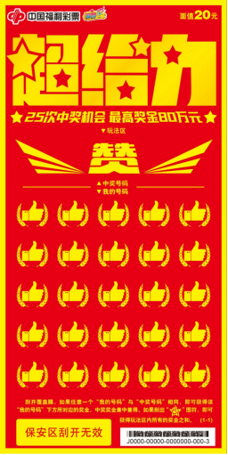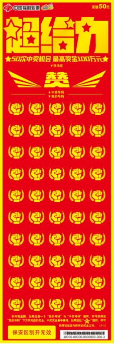 中奖个数之最:刮刮乐“超给力50元”是“超给力”系列彩票中的一款,票面以五角星作为装饰主体,采用经典的红黄搭配,鲜艳醒目。该票面值50元,共有50次中奖机会,11个奖级,最高奖金100万元。