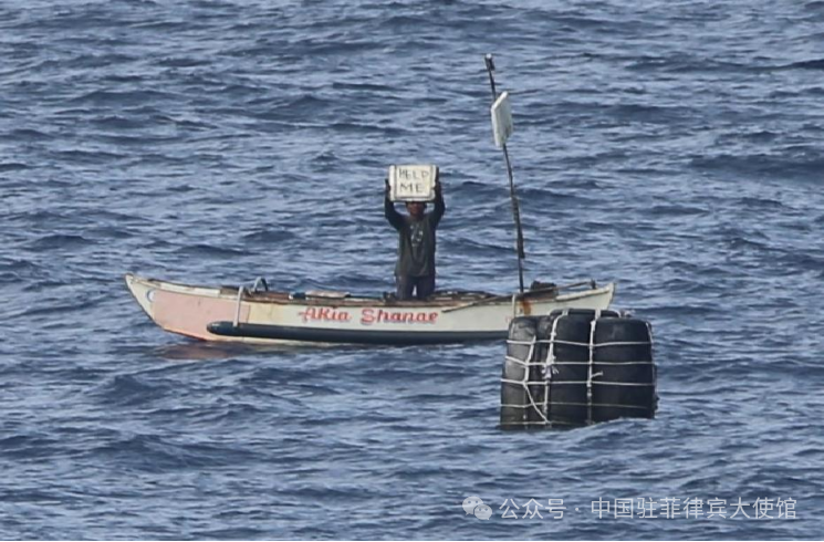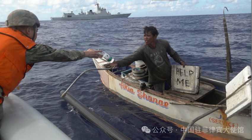 该船因机械故障已滞留海上三日,船上渔民饮水及食物短缺。中国海军迅速行动,派出救援艇向菲方渔船紧急提供饮用水、食品等必要生活物资,有效保障渔民生命安全。期间,中方与菲律宾海警船 4408号进行了必要沟通协调。