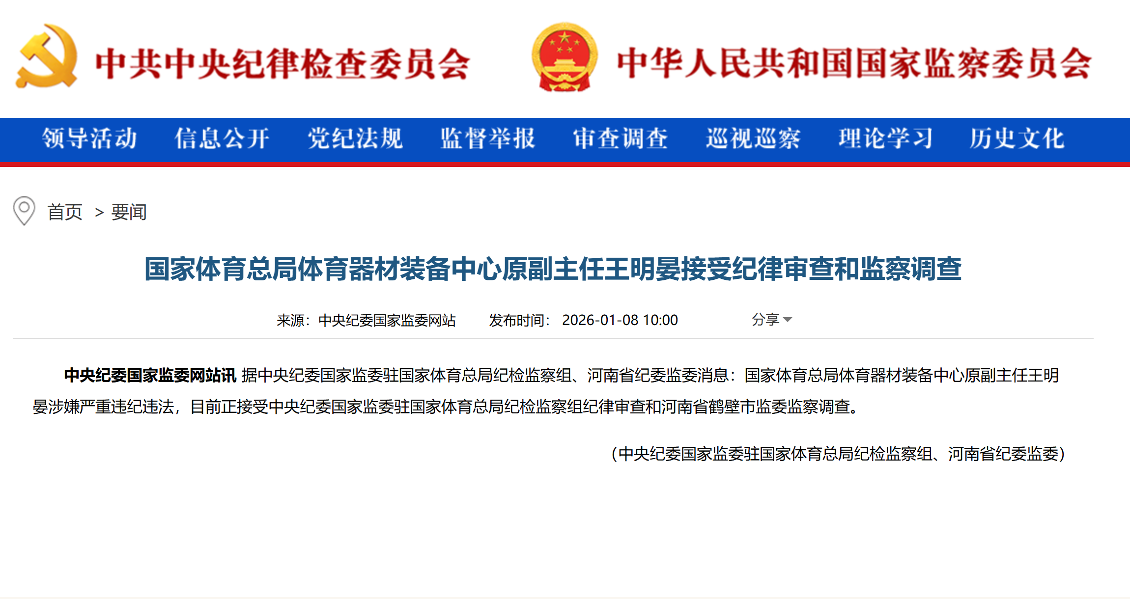 中央纪委国家监委网站1月8日消息,国家体育总局体育器材装备中心原副主任王明晏涉嫌严重违纪违法,目前正接受中央纪委国家监委驻国家体育总局纪检监察组纪律审查和河南省鹤壁市监委监察调查。