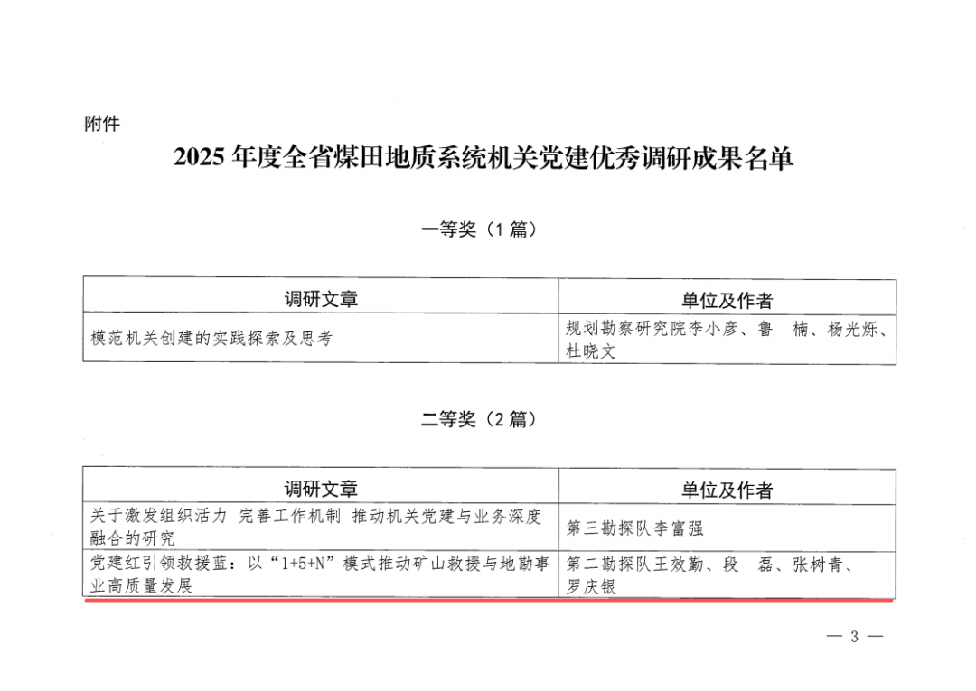 近日,山东省煤田地质局机关委员会通报2025年度全省煤田地质系统机关党建优秀调研成果评选结果,山东省煤田地质局二队(国家矿山应急救援山东特勘队)报送的两篇调研作品分获佳绩,彰显了该队在党建理论研究与实践融合领域的扎实成效。