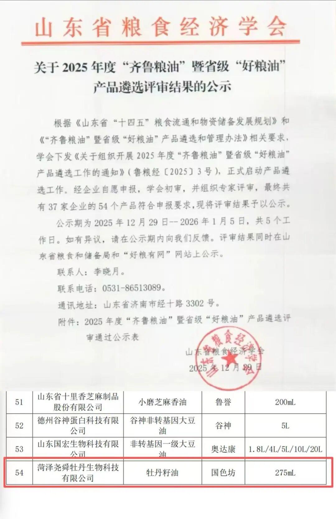 近日,2025年度“齐鲁粮油”暨省级“好粮油”产品遴选结果正式揭晓。菏泽尧舜牡丹生物科技有限公司旗下核心产品——“国色坊”牡丹籽油凭借卓越的产品品质、突出的营养优势与深厚的技术积淀,成功入选该权威榜单,为“齐鲁粮油”这一价值921亿元的国家级影响力公共品牌再添亮色。