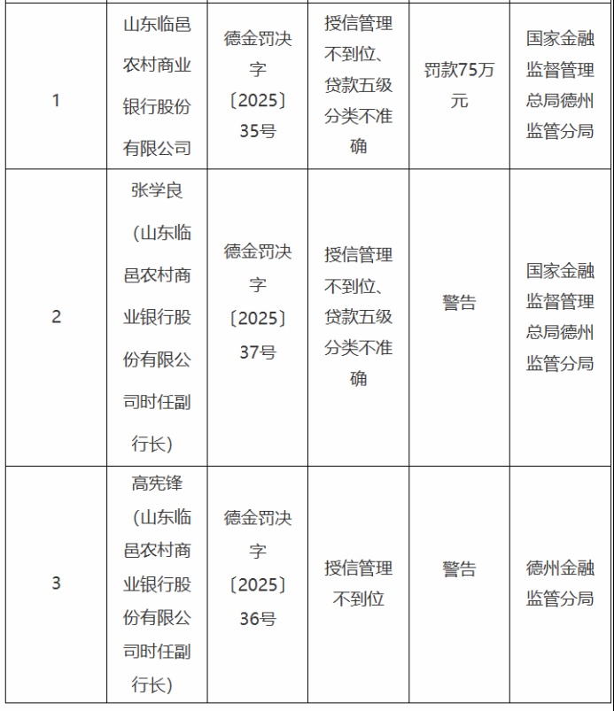 1月7日,国家金融监督管理总局山东监管局官网公示的行政处罚决定书(德金罚决字〔2025〕35号)显示,山东临邑农村商业银行股份有限公司因授信管理不到位、贷款五级分类不准确被罚款75万元。同时,张学良(山东临邑农村商业银行股份有限公司时任副行长)因对上述违法违规事实中的“授信管理不到位、贷款五级分类不准确”负有责任被警告;高宪锋(山东临邑农村商业银行股份有限公司时任副行长)因对前述违法违规事实中的“授信管理不到位”负有责任被警告。